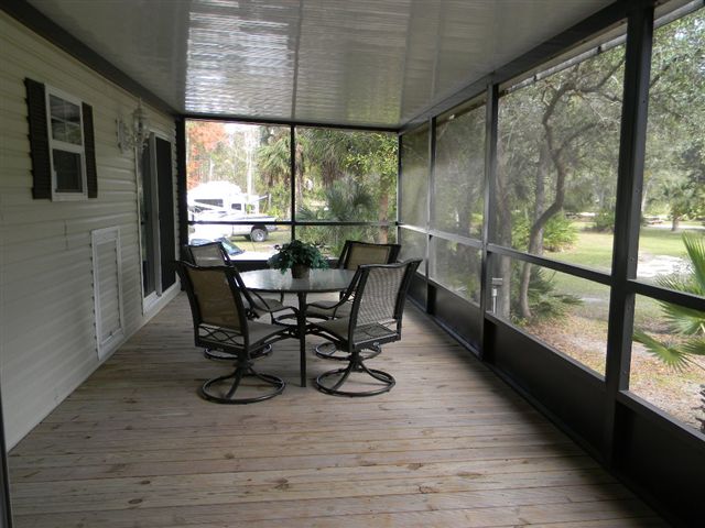 | The home offers a screened lanai with patio furniture. Beautiful palm trees and oaks enhance the paradise setting. | |